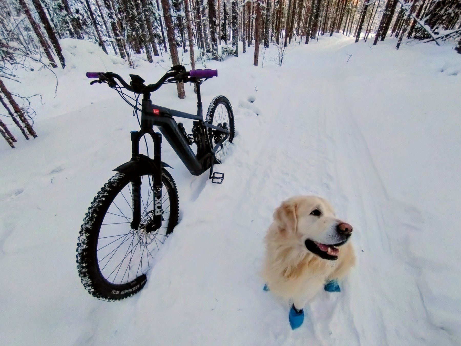 On ollut mieluinen peli talvellakin. Vaatetta vain päälle ja antaa mennä, kun on joku polku tai kelkanjälki mitä polkea, ei kummoista tarvi. Pyörä toimii hyvin ja koirakin kiittää, kun lenkit ei ole ihan matelua hänelle.