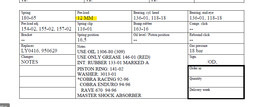 Etupukkiin öhlinsin manuaali sanoo näin ja takapukista ei ole tietoa, mutta öhlinsi sanoi että max 15mm ois esijännitys keulan iskareissa, niin samaa voi kaiketi käyttää ehkä alustassakin.